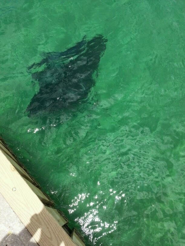 Mens vi sad under ‘solskærmen’ på bådebroen var et dansk par på vej mod os da de pludselig råbte ‘Hey!’ og vinkede os over til dem samtidig med, at de pegede ned i vandet. Hurtigt kom vi på benene og småløb de ti meter hen til kanten. Og der svømmede en stor flot Mantarey – Djævlerokke – helt inde ved bådebroen. Den passerede lige så stille og roligt forbi helt oppe i overfladen. Med den retning den svømmede så, havde den lige været helt inde ved stranden, hvor vi lidt tidligere havde badet! Denne var større end de Stingreys vi havde set på den anden side af Tobago.