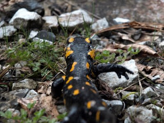 Det regnede da ikke til morgen, men der var stadig skyer på himlen, men også blå huller. Formiddagens skulle bruges på de 12 guders bjerg – Mount Olympus. Der er stadig masser af sne på bjerget så vi havde ingen intentioner om at komme på toppen. Den højeste top er 2917 m.o.h., men op ad bjerget skulle vi. Fra Litochoro kan man køre 18 km ad en vej til Prionia i 1100 m.o.h., hvorefter man skal gå resten af vejen, hvis man vil højere. Efter 4 km passerer man en kontrolpost, hvor en nydelig ung uniformeret pige spurgte hvor vi var fra og hvor vi skulle hen…. øh.. op på bjerget og vandre lidt…. Det var sikkert bare statistik til myndighederne og noget med EU støtte at gøre. Vi kørte op ad en lille smal snoet vej med en masse nedfaldne sten, så der var nogle steder man ikke skulle gøre holdt. Det meste ad ruten gik igennem blandingskov bestående af forskellige løvtræer og fyrre- og pinjetræer med enkelte steder, hvor en bil lige kunne holde i siden, hvis man skulle have et kig ud og nyde udsigten. For enden af vejen parkerede vi ved den lille restaurant, skiftede til vandrestøvler og begyndte turen videre opad til fods. Skyerne hang lavt, så det var nærmest tåget og vi fik kun et kortvarigt glimt at de sneklædte tinder, men på trods af det var der mange fugle. Der var bl.a. spætmejser, bogfinker, sortmejser og rødtoppede fuglekonger. Vi hørte sågar en natugle og så en sortspætte. Undervejs så vi også flere gevaldig store sorte salamandere med gule tegninger kravle sløvt over stien. Man kunne faktisk blive helt forskrækket når man pludselig opdagede en lige foran sig. Efter en times vandring besluttede vi os at vende om. Vi havde absolut fået varmen efter at være kommet op i 1360 m.o.h, men det var stadig bare skov og ikke meget andet. Turen op til til toppen er beregnet til ca. 7 – 8 timer, så vi var endnu langt fra trægrænsen. På bilturen ned fra bjerget stoppede vi flere gange for at se udsigten, kigge på planter og ikke mindst nyde madpakken. Den spiste vi i ca. 700 m.o.h. ved en lodret klippevæg med ca 400 meters lodret fald til bunden af kløften! Meget flot og så var der samtidig en syngende blådrossel, klippesvaler, et par ravne og en fodboldkamp på stadion i Litochoro.