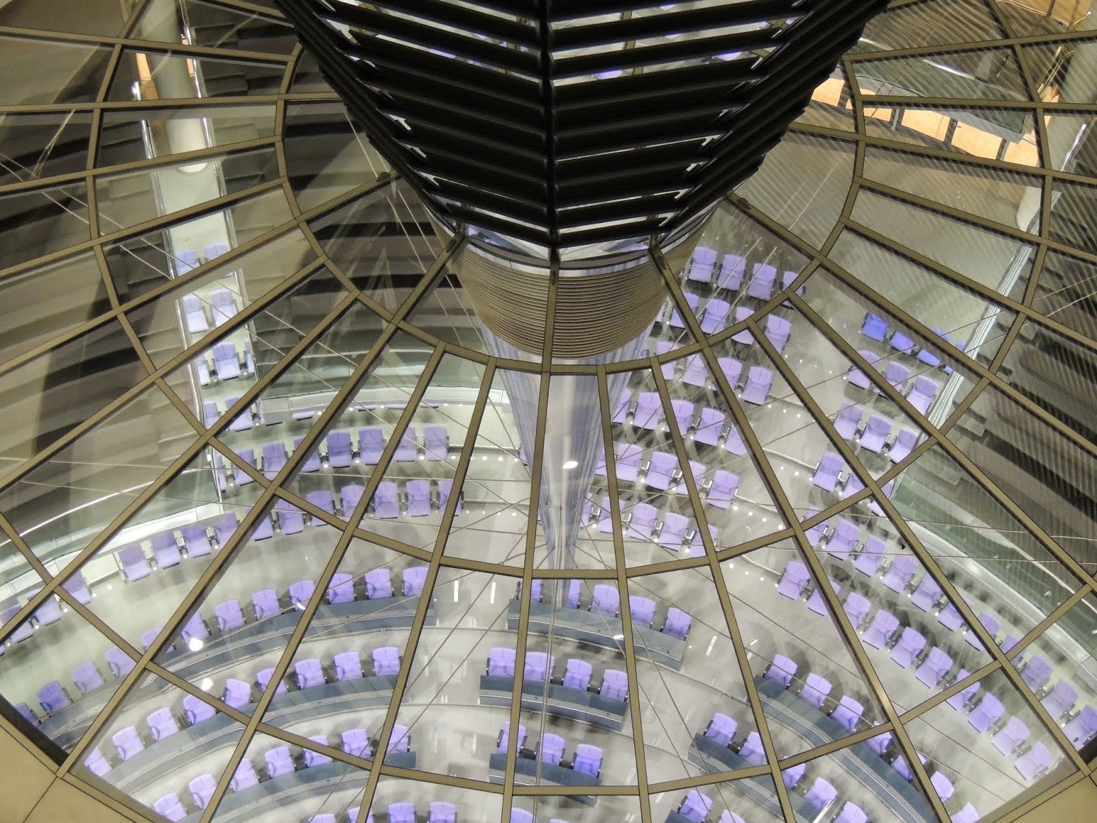 Efter aftensmaden gik vi op til Reichtag, hvor vi have booket en tur op i glaskuplen for at se ud over Berlin i aftenmørket. Det bragte os forbi Brandeburger Tor, hvor ZDF var i fuld gang med forberedelserne til det store nytårsshow. For at komme ind og op i kuplen skulle man igennem et sikkerhedstjek som i lufthavnen, men det tog heldigvis ikke lang tid og inden længe var vi bragt op på taget med elevator. Der var en del andre turister, de fleste udstyret med headset og var på ‘guidet’ tur op i kuplen. Vi sprang ‘lytteturen’ over. Men det var en god tur, flot og spændende arkitektur, og flot og se ud over en del af Berlin i mørket.