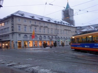 hvergang der passerer en sporvogn nede paa gaden. Og som det maaske kan ses paa billedet saa regner det nu hernede. I gaar var det snevejr (det smeltede dog naar det landede paa jorden) men graat og kedeligt vejr. Men saa er det jo godt at man sidder til undervisning indendörs hele dagen 🙂