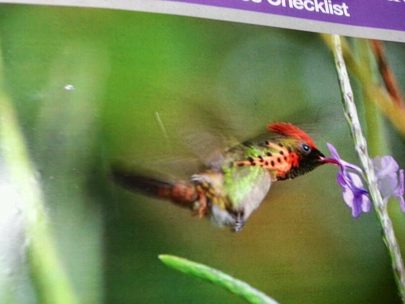 Dagen startede som i går med at kigge på kolibrier, men bare tidligere. Bortset fra tålmodighed krævede det godt med myggemiddel. Men ventetiden blev faktisk ikke så lang i dag, hvilket måske skyldtes den tidligere start, da en flot han Tufted Coquette dukkede op mellem de 3 – 4 hunner, der allerede var i fuld gang. Fedt så fik jeg også set den og det var ikke kun i et glimt. Vi havde fornøjelse af den i op til flere minutter og på pænt tæt hold. Bente fik også taget nogle fotos som nogle af folkene fra Asa Wright sagde var ‘a pretty good one’. Det kan godt være, at det var sagt i al høflighed, men taget i betragtning af udstyret m.m. så var det da bestemt et udemærkede doku-foto. Et af dagens foto (se nedenfor) skulle egentlig have været et foto – taget med mobiltelefon – af et foto vist på kameradisplayet og zoomet ind. Men det blev simpelthen for dårligt, så fotoet, der viser en tufted Coquette han er et foto af forsiden af Asa Wrights Nature Centre – species checklist. Nu har der været skrevet så meget om den, at der måtte et billede til.